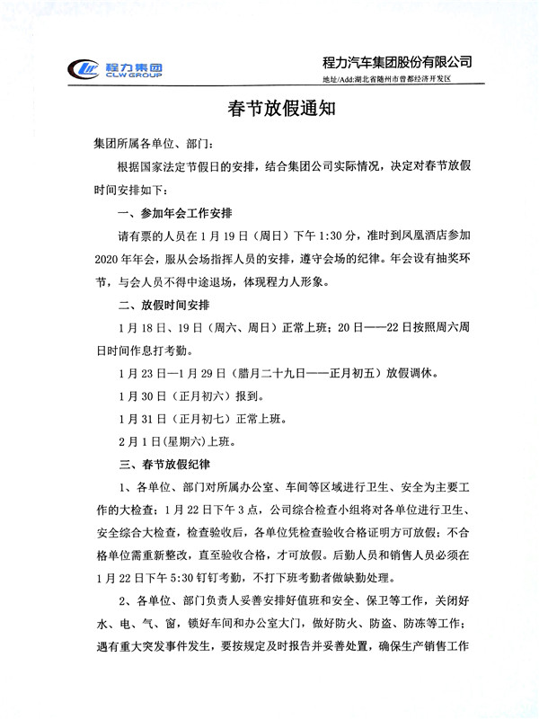 2020年喜迎新春佳節,湖北程力集團專用汽車有限公司春節工作安排: 請持票人員在1月19日(星期日)下午1:30準時到鳳凰酒店參加2020年度年會,要求參會人員統一著藍色工作服入場,服從會場指揮人員的安排,遵守會場紀律,會議期間請保持良好紀律并不得中途退場,體現程力精神,會議最后舉行抽獎活動。 |