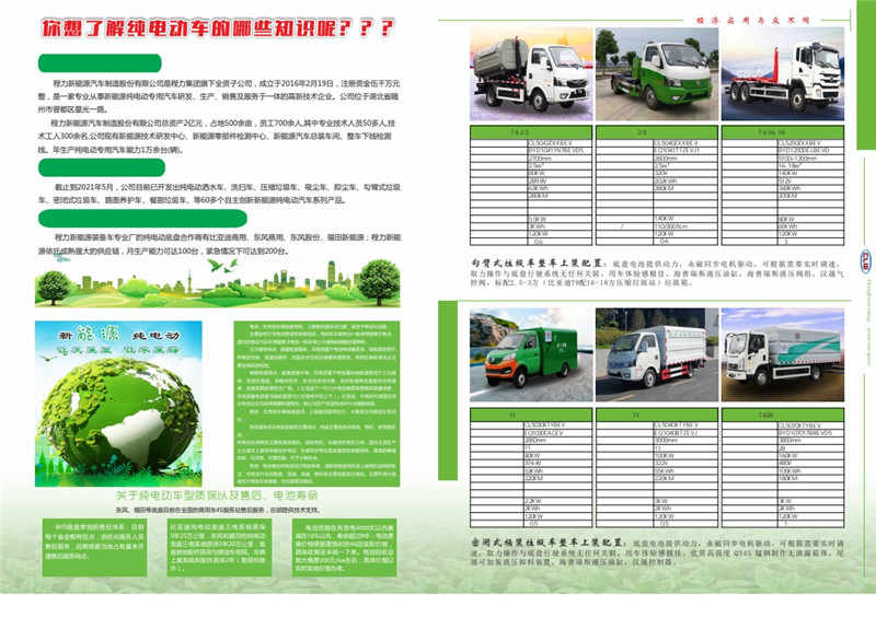 程力新能源純電動專用汽車隸屬于程力集團,簡稱“程力新能源”,集團是一家擁有“國家高新技術(shù)企業(yè)”“中國民企500強”“中國馳名商標”的大型汽車制造集團,是集汽車技術(shù)研發(fā)、汽車制造、客車制造、汽車改裝、汽車零部件、金融、教育、置業(yè)投資為一體的多元化集團公司。 關(guān)于程力新能源汽車 程力新能源汽車制造股份有限公司是程力集團旗下全資子公司,成立于2016年2月19日,注冊資金伍千萬元整,是一家專業(yè)從事新能源純電動專用汽車研發(fā)、生產(chǎn)、銷售及服務(wù)于一體的高新技術(shù)企業(yè)。公司位于湖北省隨州市曾都區(qū)星光一路。 程力新能源汽車制造股份有限公司,占地500余畝,員工700余人,其中專業(yè)技術(shù)人員50多人,技術(shù)工人300余名,公司現(xiàn)有新能源技術(shù)研發(fā)中心、新能源零部件檢測中心、新能源汽車總裝車間、整車下線檢測線。年生產(chǎn)純電動專用汽車能力1萬余臺(輛)。 關(guān)于程力純電動車型 截止到2021年5月,公司目前已開發(fā)出純電動灑水車、洗掃車、壓縮垃圾車、吸塵車、抑塵車、勾臂式垃圾車、密閉式垃圾車、路面養(yǎng)護車、餐廚垃圾車、等60多個自主創(chuàng)新新能源純電動汽車系列產(chǎn)品。 主要純電動底盤合作商以及生產(chǎn)能力 程力新能源裝備車專業(yè)廠的純電動底盤合作商有比亞迪商用、東風(fēng)商用、東風(fēng)股份、福田新能源;程力新能源依托成熟強大的供應(yīng)鏈,月生產(chǎn)能力可達100臺,緊急情況下可達到200臺。 關(guān)于純電動汽車三電系統(tǒng) 電池:負責(zé)給車輛底盤電機、上裝電機提供動力源,相當于燃油車油箱;新能源純電動主要由電芯與電池管理系統(tǒng)等組成,電動車車載電池一般使用鋰離子電池,國內(nèi)的電動汽車所用鋰離子電池一般采用三元鋰電和磷酸鐵鋰兩種。 讓天更藍讓水更綠 三元鋰電特點:能量密度最高,同等質(zhì)量下電池電容量更高,續(xù)航里程更長,熱穩(wěn)定性差、低溫性能好,但是安全性相比磷酸鐵鋰更差。特斯拉等歐美車主要選擇此類電池。 磷酸鐵鋰特點:能量密度中等,同等質(zhì)量下電容量和續(xù)航里程低于三元鋰電,低溫性能差、熱穩(wěn)定性好;安全性相當可靠,在所有鋰電池里面安全性最高,且其發(fā)展前景相當廣闊。(比亞迪下一代刀片電池就具有更高的能量密度。同等質(zhì)量電容量與續(xù)航里程與三元鋰電不相上下)、比亞迪、寧德時代等國內(nèi)頂尖電池企業(yè)均采用磷酸鐵鋰電池;我公司生產(chǎn)車型電池90%為磷酸鐵鋰。 電機:負責(zé)給車輛底盤驅(qū)動、上裝驅(qū)動提供動力,大概相當于燃油車發(fā)動機;電機是電動車電驅(qū)系統(tǒng)的主要部分,電驅(qū)主要由傳動系統(tǒng)、電機、逆變器組成,純電動車用電機主要有直流電機、感應(yīng)電機、永磁同步電機三種。國內(nèi)主流生產(chǎn)企業(yè)基本上都用永磁同步電機,永磁同步電機具有最低的電能損耗、最高的峰值效率、比功率、可靠性強、尺寸小等優(yōu)點。 電控:電池輸出的電流經(jīng)過電控系統(tǒng),調(diào)控到底盤電機或上裝電機適用的電壓,對電動汽車的爬坡、加速、減速、倒車等主要性能進行調(diào)控。主要作用大概相當于燃油車變速箱:但功能更加復(fù)雜。關(guān)于純電動車型質(zhì)保以及售后、電池壽命東風(fēng)、福田等底盤目前在全國的商用車4S服務(wù)站售后服務(wù),總部提供技術(shù)支持。 BYD底盤單獨的售后體系、目前比亞迪純電動底盤三電系統(tǒng)質(zhì)保電池性能在充放電4000次以內(nèi)衰每個省會都有駐點,由駐點服務(wù)人員5年25萬公里,東風(fēng)和福田的純電動減在15%以內(nèi),壽命超過8年;電池更售后服務(wù),后期根據(jù)當?shù)卣加辛縼黹_底盤三電系統(tǒng)質(zhì)保5年20萬公里;底換價格根據(jù)更換時的4S店實際價格,底盤其他配件質(zhì)保與燃油車相同。車輛具體政策還未統(tǒng)一下來。電池回收目通售后服務(wù)網(wǎng)點。上裝系統(tǒng)和配件質(zhì)保2年(易損件除前大概是200元/kw左右;具體價格以外)。實時實地價格為準。 目前程力新能源汽車制造股份有限公司已取得新能源純電動專用車作業(yè)類、廂式類整車生產(chǎn)許可資質(zhì),公司已開發(fā)純電動灑水車,抑塵車廂式運輸車、純電動冷藏車、純電動勾臂式垃圾車、純電動密閉式垃圾車等10多個自主創(chuàng)新新能源純電動汽車系列產(chǎn)品。 |
