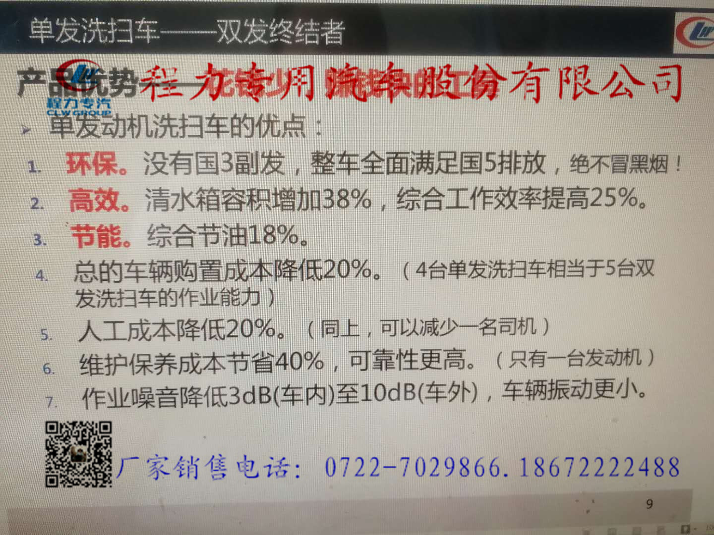 湖北程力掃路車第三屆交流大會(huì)新品發(fā)布《單發(fā)動(dòng)機(jī)洗掃車》 。湖北程力掃路車新品發(fā)布會(huì)上鄧博士講解單發(fā)洗掃車工作原理,單法洗掃車,真正國五排放,較雙發(fā)洗掃車工作效率提升20%,油耗降低18%,操作系統(tǒng)更平穩(wěn),符合國家節(jié)能減排大趨勢(shì),值得推廣! 湖北程力公司生產(chǎn)的掃路車具有被用戶普遍首肯的清掃、抽吸效率高,作業(yè)性能穩(wěn)定等特點(diǎn)。被廣泛應(yīng)用于城市街道、廣場(chǎng)、碼頭、機(jī)場(chǎng)、高架橋等場(chǎng)所的地面清掃、保潔。 |