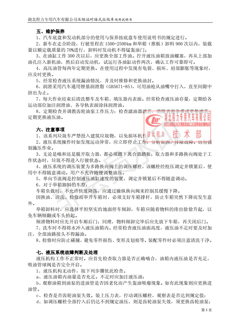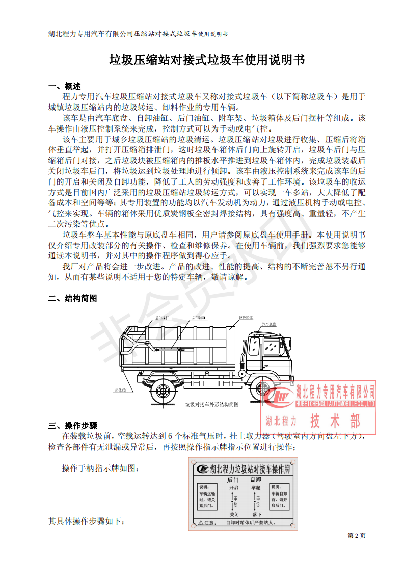 湖北程力垃圾壓縮站對接式垃圾車使用操作說明書
