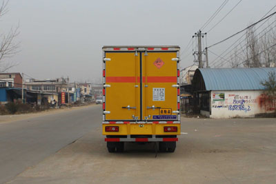 廂體頂部封閉,不可開啟。隨底盤選裝駕駛室。 并選裝側開門。側/后防護裝置材料材質為Q235A碳鋼,側防護與副梁,后防護裝置與車架均采用焊接連接,后防護斷面尺寸(寬×高)50×100(mm),離地高度為440mm.運輸品名:炸藥,雷管,煙花爆竹等,類項號:1.1B,1.1D,1.1G,1.2G,1.3G,1.4G等;安裝帶衛星定位功能的行駛記錄儀;配裝限速裝置,最高時速80km/h。僅采用有前盤制動器和安裝ABS的底盤。僅采用子午線輪胎。僅采用排氣管前置的底盤。該車裝有ABS;ABS型號:355080020,生產廠家:浙江亞太機電股份有限公司。僅采用JX493ZLQ4發動機,油耗值為12.6。